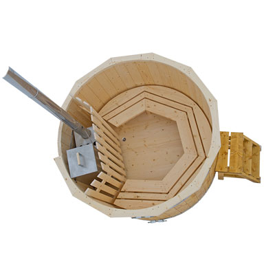 Interiorul ciubarului din lemn cu sobă încorporată este împărțit într-o zonă mai mică cu sobă separat printr-un gard de protecție, precum și o zonă mai mare – pentru scăldat.